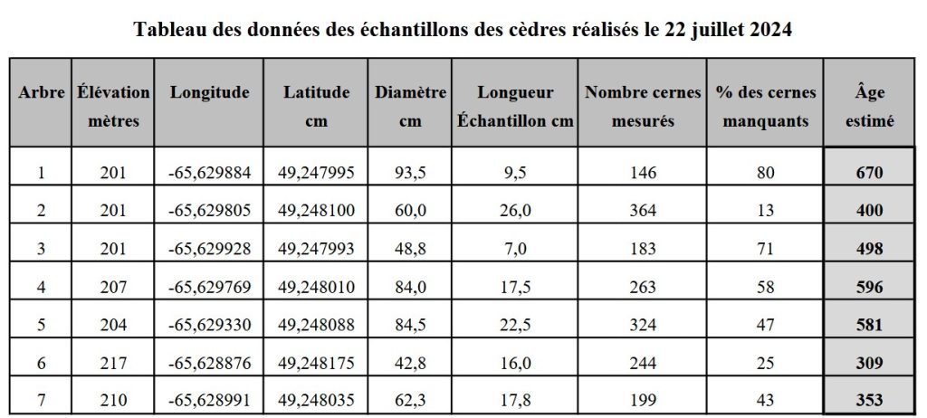 Le verdict est finalement tombé. Viateur de Champlain avait vu juste. Sept arbres ont été échantillonnés et les plus vieux ont été estimés à 581, 596 et 670 ans. Les autres ont tout de même atteint les âges vénérables de 309 à 498. On peut donc avancer, sans trop avoir peur de se tromper, que ces arbres sont parmi les plus vieux en Gaspésie et possiblement en Amérique du Nord. Le seul autre endroit au Québec où l’on a répertorié des arbres de 800 ans et plus est dans la Réserve écologique des Vieux-Arbres en Abitibi-Ouest.