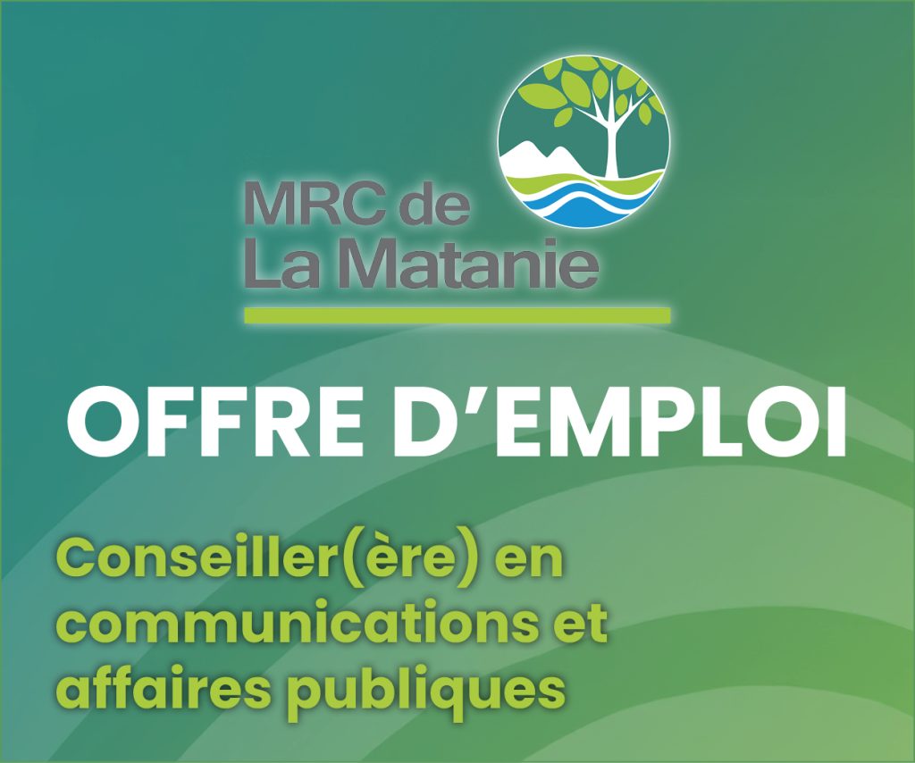 Sous l’autorité de la direction générale, la personne titulaire du poste est responsable des communications pour la MRC. Par ses actions, en plus de supporter les différents services, elle contribue à promouvoir le positionnement, le rôle et la mission de la MRC de La Matanie, autant à l’interne qu’auprès de la population et des partenaires de l’organisation et dans les médias sociaux. Elle travaille avec plusieurs partenaires et sur une grande variété de projets. Elle est disponible en dehors des heures normales de bureau.